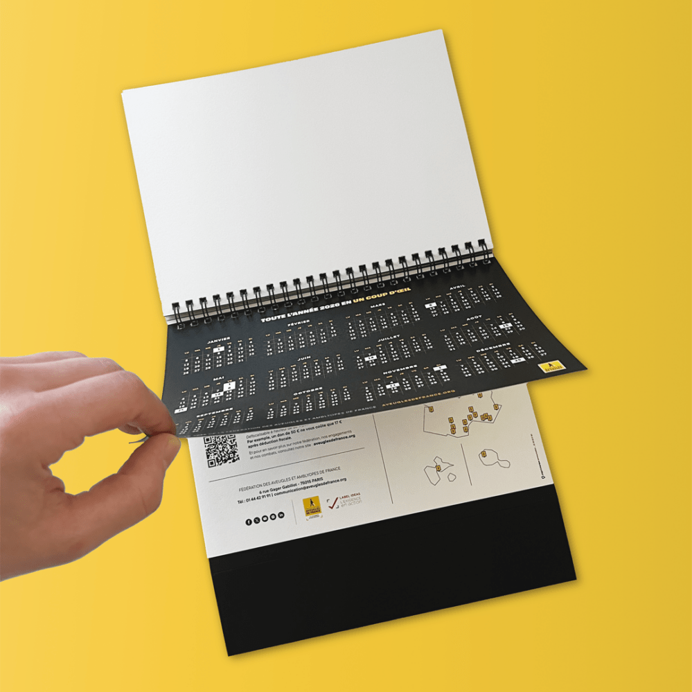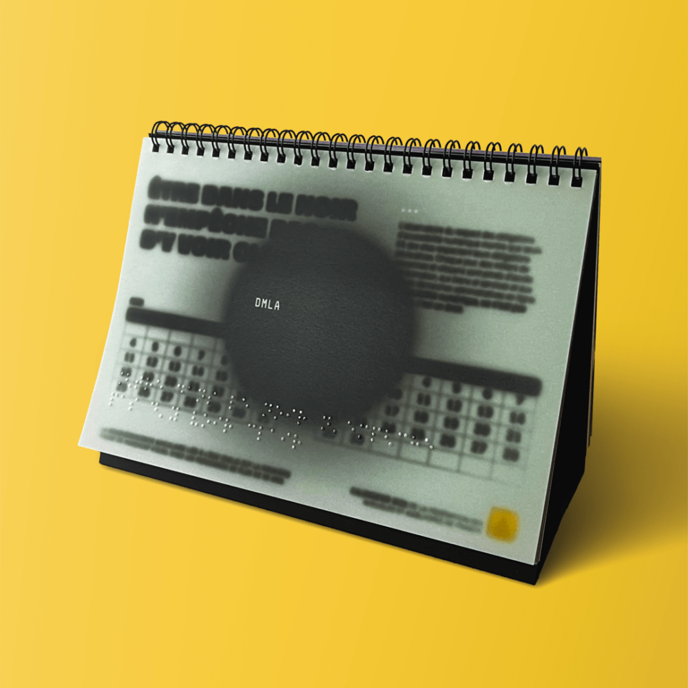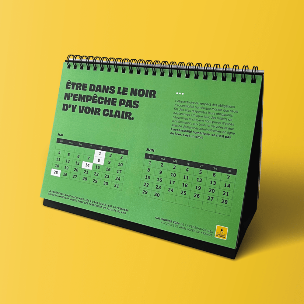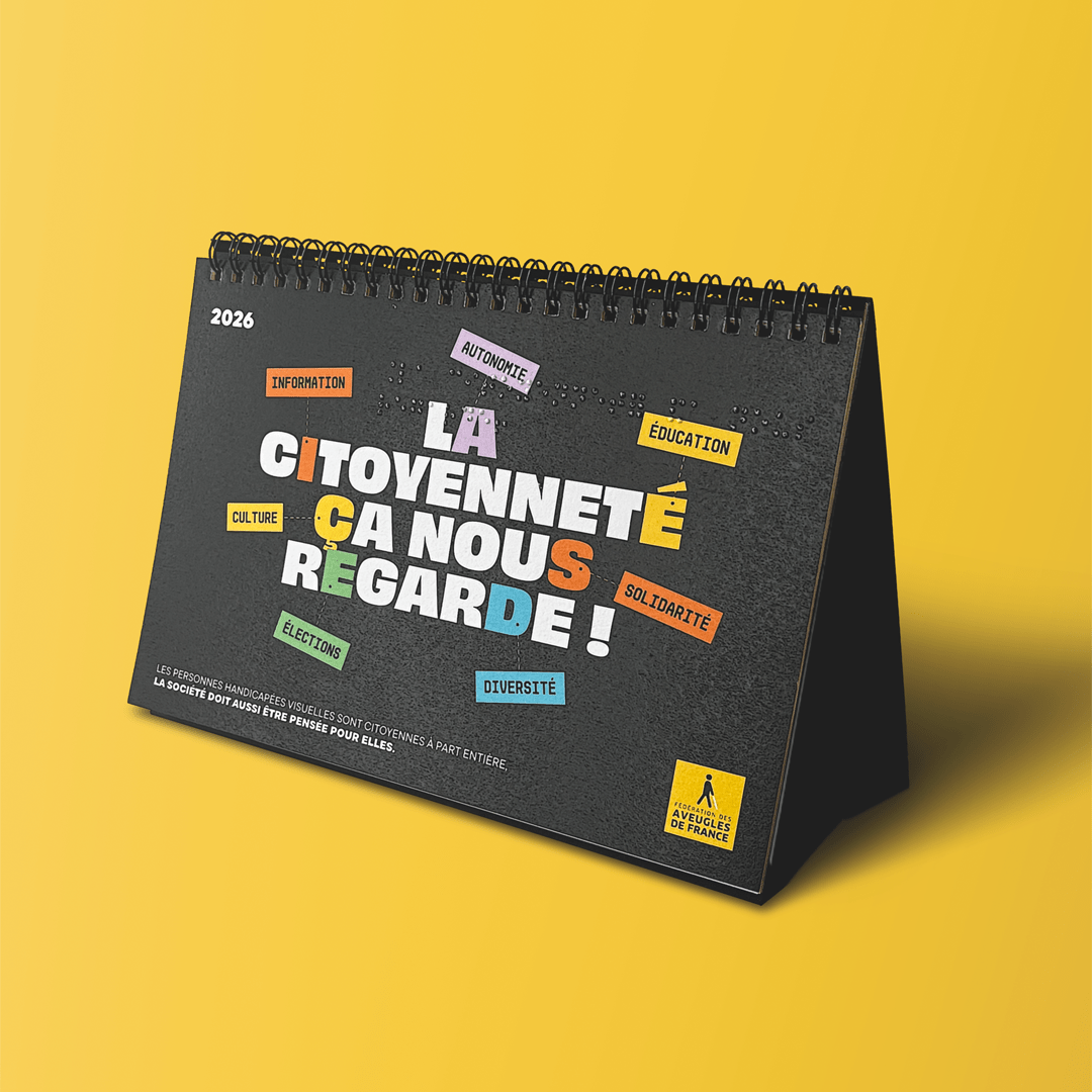 Pour la Fédération des Fédération des Aveugles de France, nous avons conçu un calendrier chevalet inclusif, pensé pour sensibiliser aux déficiences visuelles et à l’accessibilité. 🗓️